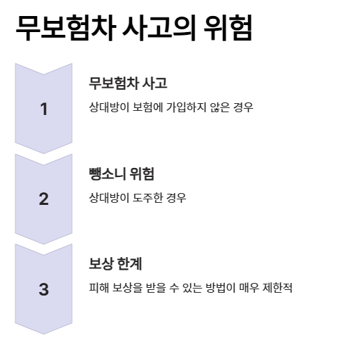 책임보험만 가입한 경우, 무보험차나 뺑소니 차량에 의한 사고 시 적절한 보상을 받지 못할 수 있습니다. 상대방이 보험에 가입하지 않았거나 도주한 경우, 피해 보상을 받을 수 있는 방법이 매우 제한적입니다. 이는 특히 심각한 부상이나 장기 치료가 필요한 경우 더욱 큰 문제가 됩니다.