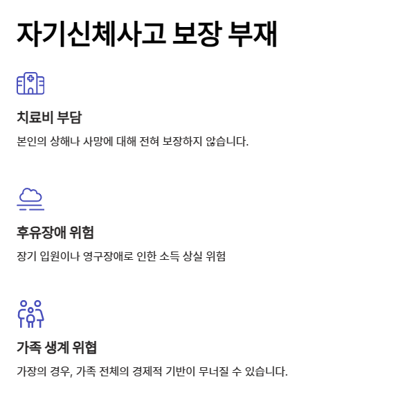 책임보험은 운전자 본인의 상해나 사망에 대해서는 전혀 보장하지 않습니다. 단독사고나 본인 과실이 큰 사고의 경우, 치료비와 후유장애로 인한 모든 비용을 개인이 부담해야 합니다. 특히 가장의 경우, 장기 입원이나 영구장애로 인한 소득 상실은 가족 전체의 생계를 위협할 수 있습니다.