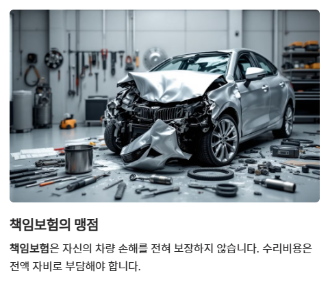 책임보험은 자신의 차량 손해를 전혀 보장하지 않는다는 큰 맹점이 있습니다. 교통사고 발생 시 본인 차량의 수리비용은 전액 자비로 부담해야 하며, 이는 고가 차량일수록 더 큰 경제적 부담이 됩니다. 특히 차량이 생계 수단인 경우, 수리 기간 동안의 영업 손실까지 고려하면 그 피해액은 더욱 커질 수 있습니다.