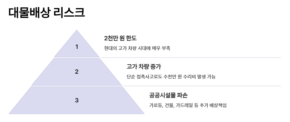 책임보험의 대물배상 한도는 2천만 원으로, 현대의 고가 차량 시대에는 매우 부족한 수준입니다. 최근에는 수입차나 고급차의 비중이 높아져, 단순 접촉사고만으로도 수천만 원의 수리비가 발생할 수 있습니다. 또한 차량 외에도 가로등, 건물, 가드레일 등 공공시설물 파손에 대한 배상책임도 발생할 수 있습니다.