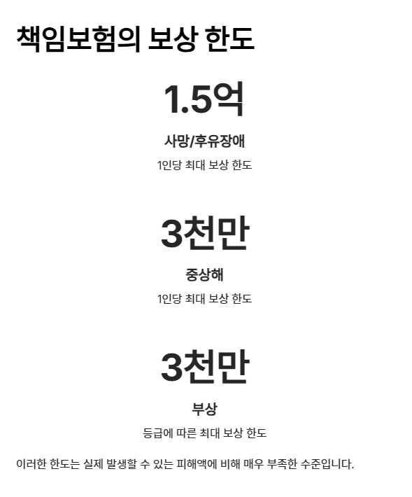 책임보험의 보상 한도는 사망이나 후유장애의 경우 1인당 1억5천만 원으로 제한됩니다. 중상해의 경우 3천만 원, 부상의 경우 등급에 따라 최대 3천만 원까지만 보장받을 수 있습니다. 이러한 한도는 실제 발생할 수 있는 피해액에 비해 매우 부족한 수준입니다. 특히 피해자가 고소득자이거나 장기 치료가 필요한 경우, 추가적인 배상 책임이 발생할 수 있습니다.