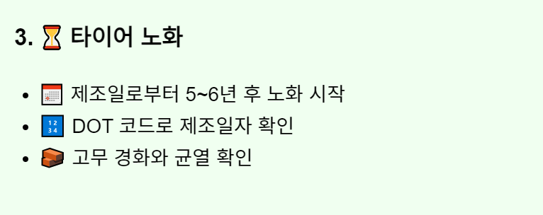 - 균열 및 손상 여부: 타이어에 작은 균열이나 미세한 금이 보이면 타이어 고무가 경화되고 있다는 신호이므로 교체를 고려해야 합니다.