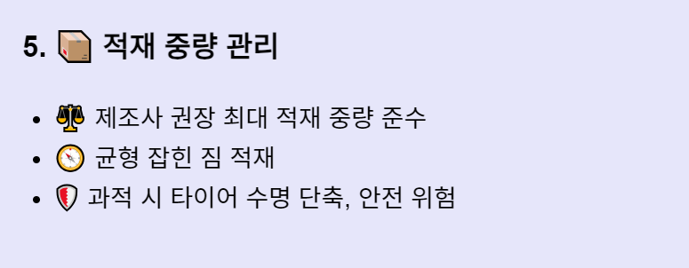 - 적정 중량: 차량 제조사가 제공하는 최대 적재 중량을 초과하지 않도록 주의하세요.