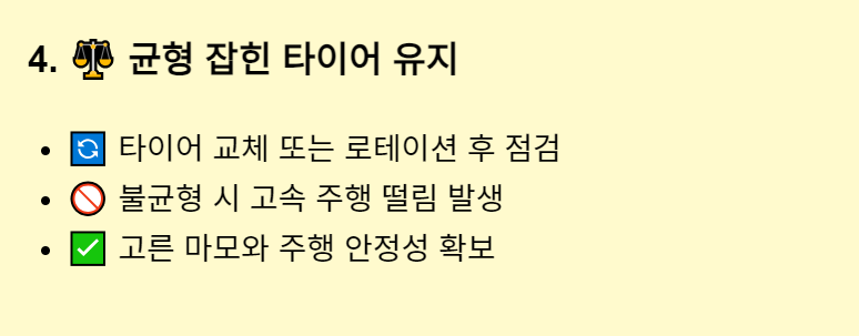 - 밸런스 체크 주기: 타이어를 교체하거나 로테이션 후에는 항상 타이어 밸런스를 점검하세요.