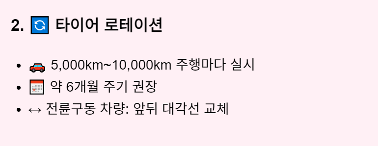 - 로테이션 주기: 약 6개월 또는 8,000km 주기로 타이어 위치를 교체하세요.