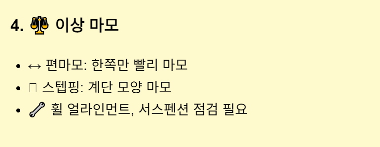 - 편마모: 타이어 한쪽이 더 빨리 닳는 현상으로, 휠 얼라인먼트 불량이 주된 원인입니다.