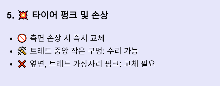 - 측면 손상: 타이어 옆면에 균열, 찢김, 혹은 불규칙한 돌출 부위가 보일 경우 즉시 교체해야 합니다.
