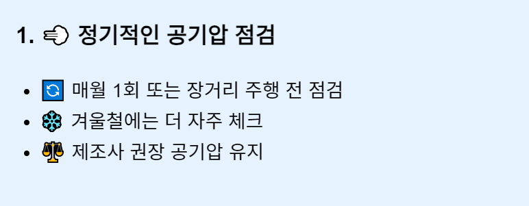 - 공기압 체크 주기: 한 달에 한 번, 혹은 장거리 주행 전에는 반드시 공기압을 확인하세요.