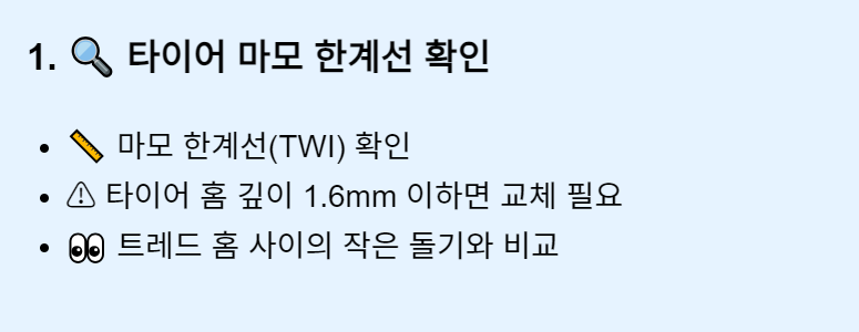 - 확인 방법: 타이어 트레드 홈 사이에 있는 작은 돌기 형태의 마모 한계선을 찾아보세요. 만약 트레드 깊이가 이 돌기와 거의 비슷해졌다면, 교체가 필요합니다.