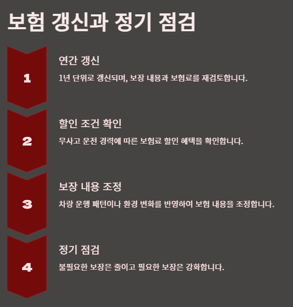 정기적인 자차 보험 점검을 통해 불필요한 보장은 줄이고 필요한 보장은 강화하는 것이 효율적입니다. 차량의 시세 변동에 맞춰 보장 한도를 조정하고, 새로운 특약이나 할인 제도가 있는지 확인하는 것이 좋습니다. 보험 기간 중이라도 필요한 경우 보장 내용을 변경할 수 있으므로, 상황 변화에 따른 유연한 대응이 가능합니다.