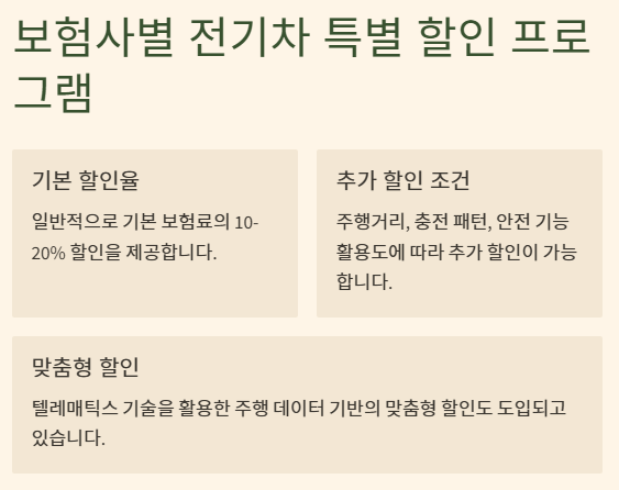 주요 보험사들은 전기차 소유자를 위한 다양한 특별 할인 프로그램을 운영하고 있습니다. 이러한 프로그램들은 일반적으로 기본 보험료의 10-20% 할인을 제공하며, 특정 조건을 충족할 경우 추가 할인이 가능합니다. 전기차의 주행거리, 충전 패턴, 그리고 안전 기능 활용도에 따라 할인율이 결정됩니다. 최근에는 텔레매틱스 기술을 활용한 주행 데이터 기반의 맞춤형 할인도 도입되고 있습니다.