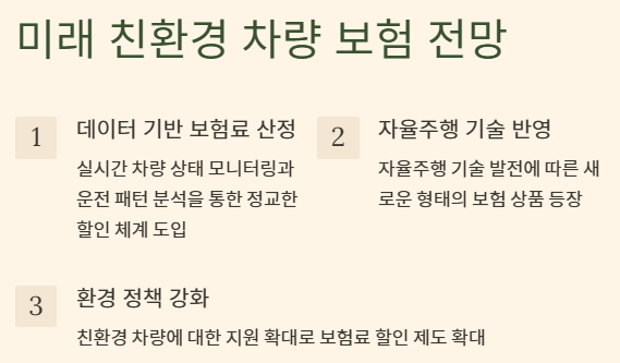 친환경 차량 시장의 성장과 함께 보험 산업도 빠르게 변화하고 있습니다. 향후에는 더욱 세분화된 데이터 기반의 보험료 산정이 일반화될 것으로 예상됩니다. 차량의 실시간 상태 모니터링과 운전자의 친환경 운전 패턴 분석을 통해 더욱 정교한 할인 체계가 도입될 것입니다. 또한 자율주행 기술의 발전에 따라 새로운 형태의 보험 상품도 등장할 전망입니다.