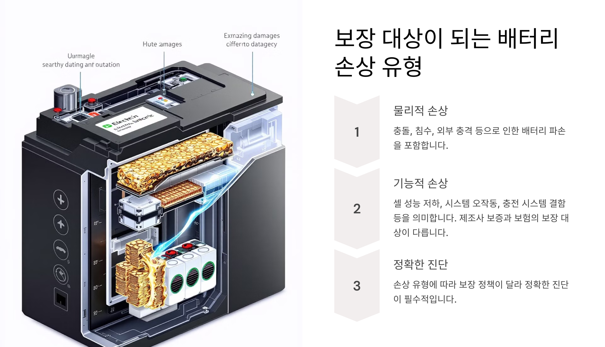 배터리 손상은 크게 물리적 손상과 기능적 손상으로 구분됩니다. 물리적 손상에는 충돌 사고로 인한 파손, 침수 피해, 외부 충격으로 인한 케이스 손상 등이 포함됩니다. 기능적 손상은 배터리 셀의 성능 저하, 관리 시스템의 오작동, 충전 시스템 결함 등을 의미합니다. 제조사 보증은 주로 기능적 손상을, 보험은 물리적 손상을 보장 대상으로 합니다.