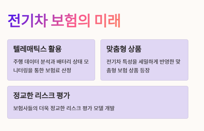 향후에는 전기차의 특성을 더욱 세밀하게 반영한 맞춤형 보험 상품이 등장할 것으로 예상됩니다. 보험사들은 전기차 시장의 성장에 발맞춰 더욱 정교한 리스크 평가 모델을 개발하고 있습니다.