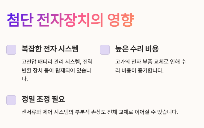 전기차에는 고전압 배터리 관리 시스템, 전력 변환 장치 등 복잡한 전자 시스템이 탑재되어 있습니다. 이러한 첨단 장치들은 사고 발생 시 높은 수리 비용을 발생시키는 요인이 됩니다. 전기차 보험료는 이러한 고가의 전자 부품 교체 위험을 반영해야 합니다.