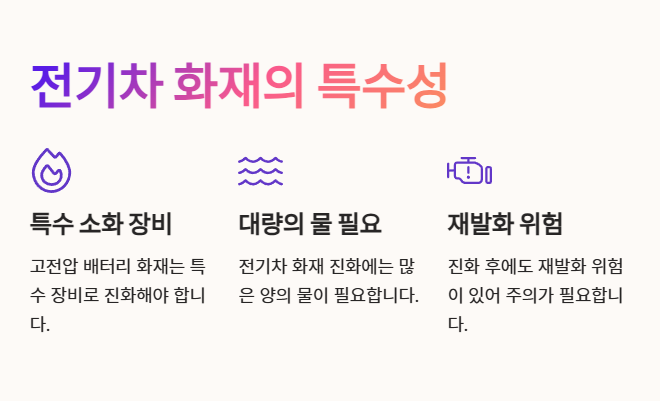 전기차 화재는 일반적인 소화 방법으로는 진화가 어려운 특수한 상황을 초래합니다. 고전압 배터리에서 발생하는 화재는 특수 소화 장비와 대량의 물이 필요하며, 진화 후에도 재발화 위험이 있습니다. 전기차 보험료에는 이러한 특수한 화재 위험이 반영되어 있습니다.