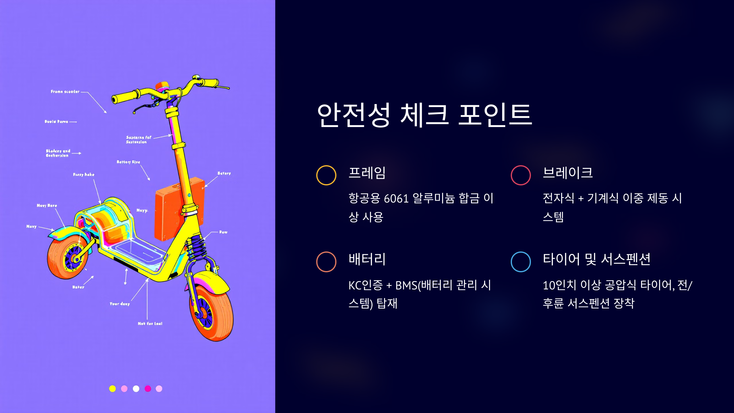 전동킥보드의 안전성은 크게 세 가지 요소로 결정됩니다. 프레임의 견고성, 브레이크 시스템의 신뢰성, 그리고 배터리의 안정성입니다. 특히 프레임은 6061 알루미늄 합금 이상의 소재를 사용해야 하며, 이중 브레이크 시스템은 이제 필수 요소가 되었습니다. 배터리는 반드시 KC인증을 받은 제품을 선택해야 하며, BMS(배터리 관리 시스템)의 존재 여부도 확인해야 합니다.