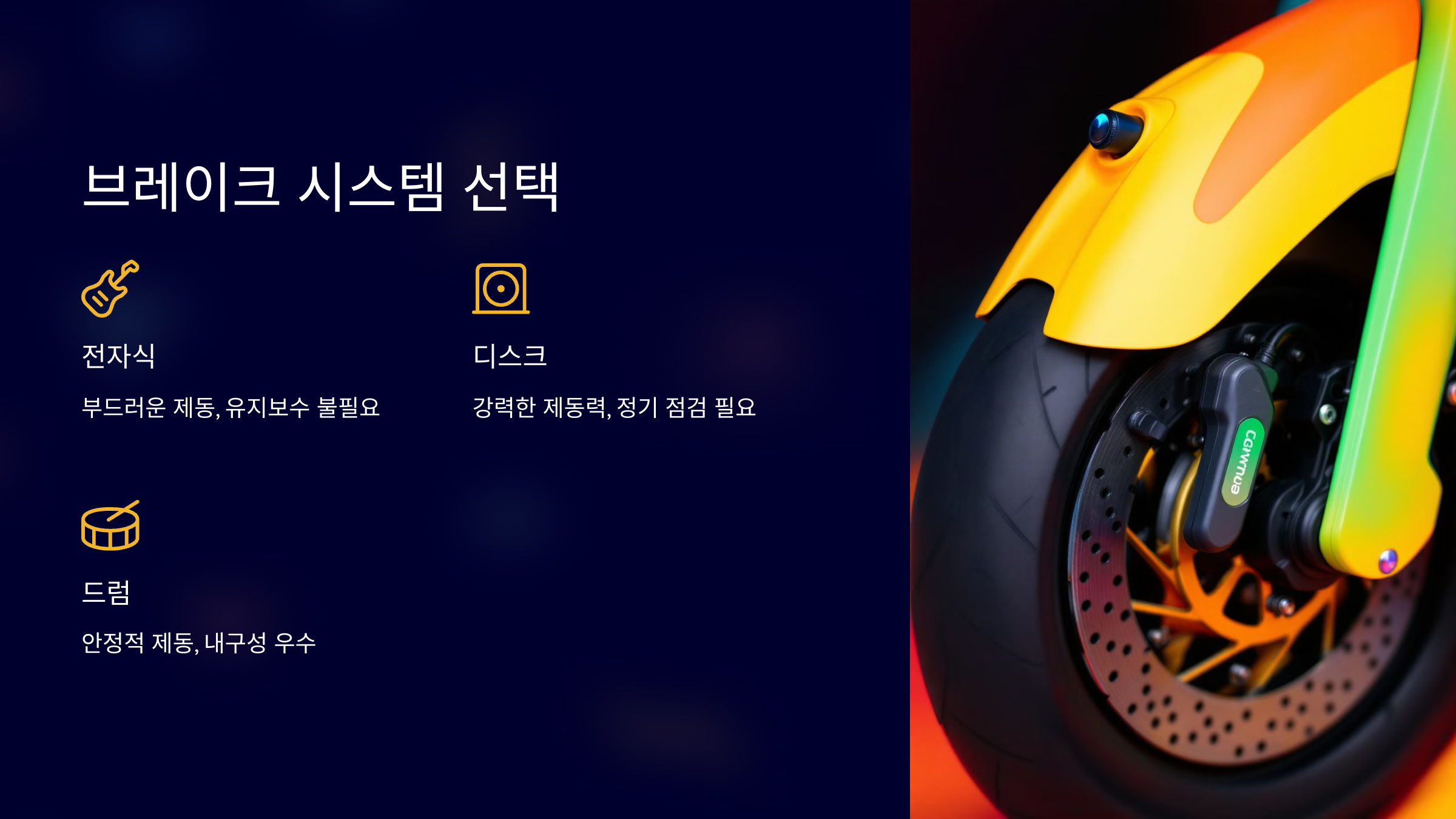 - 디스크: 강력한 제동력, 정기 점검 필요