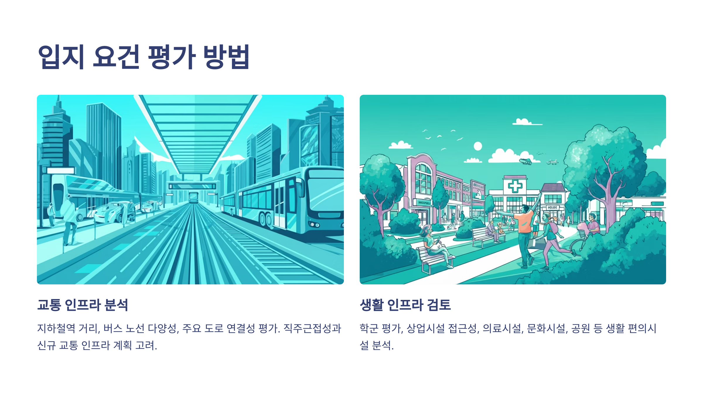 A: 교통 접근성, 생활 인프라, 학군, 개발 호재, 임대 수요 등을 종합적으로 평가해야 하며, 특히 장기적인 성장 잠재력이 가장 중요한 요소입니다.