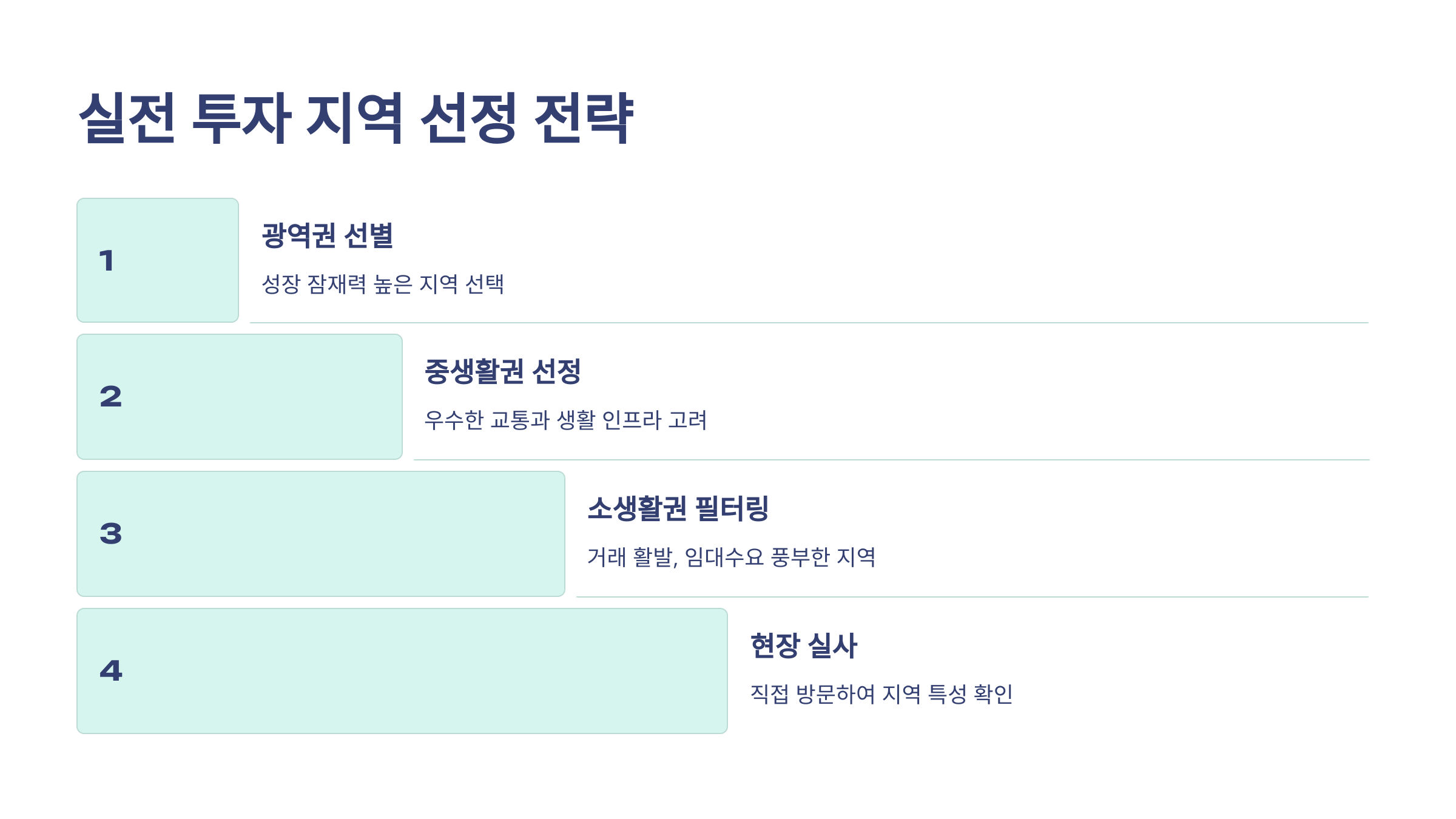 투자 지역 선정시에는 단계적인 필터링 접근법을 활용합니다. 먼저 거시적 관점에서 성장 잠재력이 높은 광역권을 선별하고, 그 안에서 교통과 생활 인프라가 우수한 중생활권을 찾습니다. 다음으로 실제 거래가 활발하고 임대수요가 풍부한 소생활권을 선별하여, 최종적으로 개별 투자 대상 지역을 확정합니다.