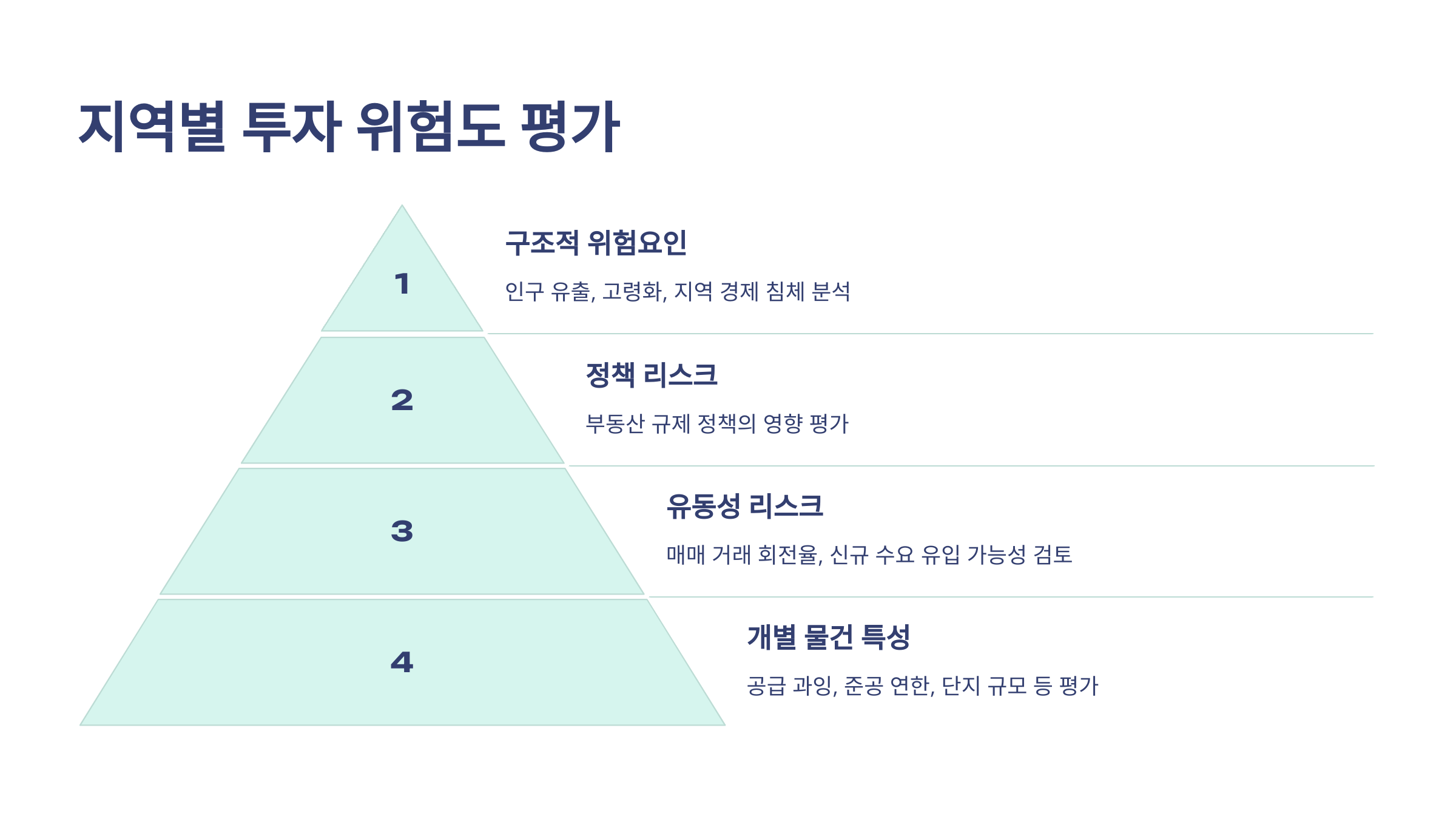 각 지역의 투자 위험 요인을 체계적으로 분석하는 것이 중요합니다. 인구 유출, 고령화, 지역 경제 침체와 같은 구조적 위험요인을 파악하고, 주변 지역 개발에 따른 수급 불균형 가능성도 검토해야 합니다. 특히 부동산 규제 정책의 영향을 받기 쉬운 지역은 정책 리스크를 면밀히 평가해야 합니다.