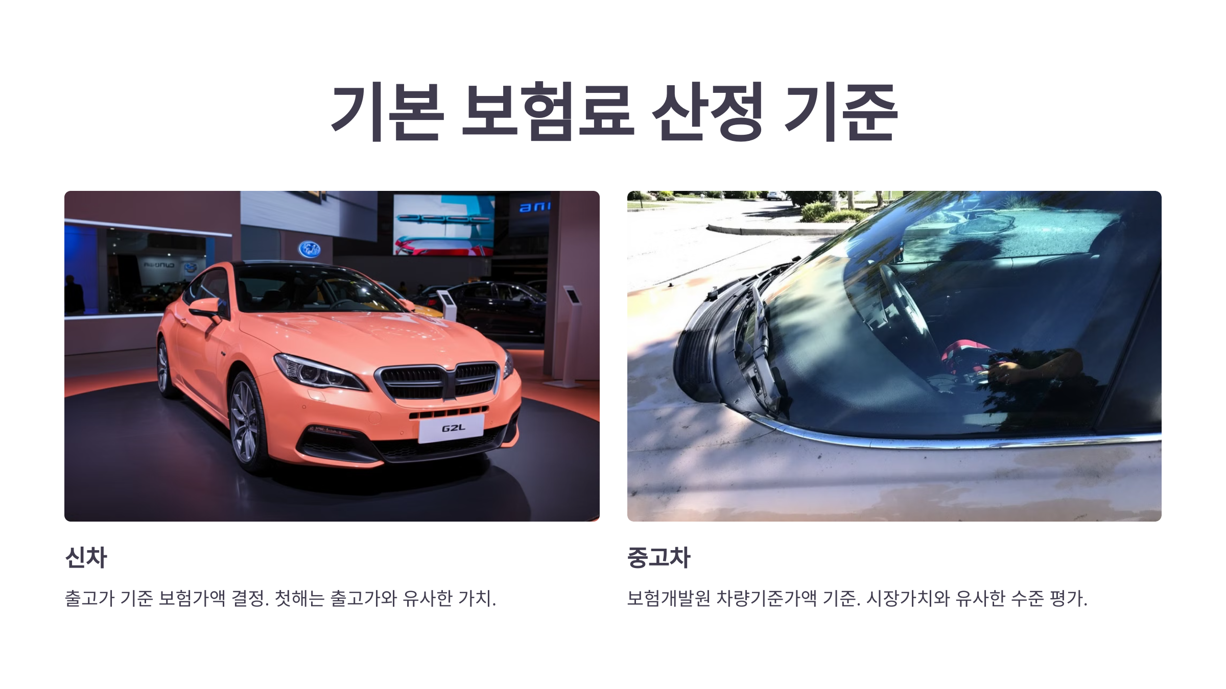 신차와 중고차의 보험료 산정에는 기본적으로 다른 접근방식이 적용됩니다. 신차의 경우 출고가를 기준으로 보험가액이 결정되며, 첫해에는 거의 출고가에 근접한 가치로 평가됩니다. 반면 중고차는 보험개발원이 산정한 차량기준가액을 바탕으로 보험가액이 결정되며, 이는 시장가치와 유사한 수준입니다. 예를 들어, 3,000만원에 구입한 신차는 첫해 그대로 3,000만원의 가치로 평가되지만, 3년된 중고차는 약 1,800만원 정도로 평가될 수 있습니다.