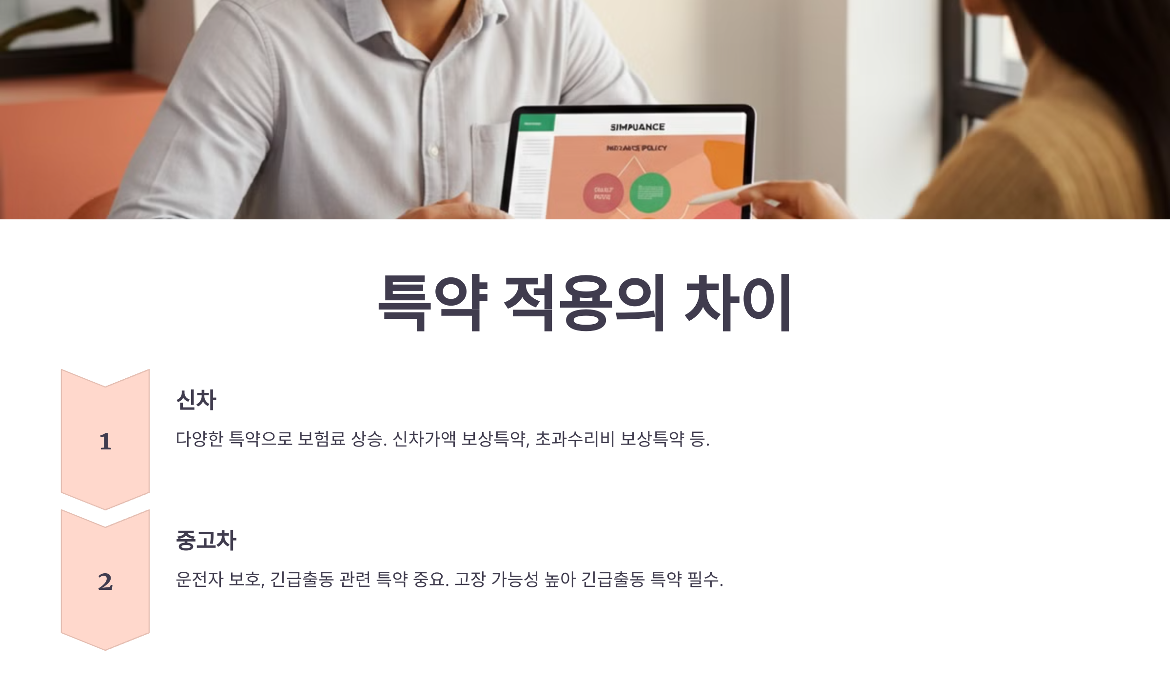 반면 중고차는 차량가액과 관련된 특약보다는 운전자 보호나 긴급출동 관련 특약이 중요합니다. 차령이 높은 중고차의 경우 고장 발생 가능성이 높아 긴급출동 특약이 필수적이며, 이는 연간 5~10만원 정도의 보험료를 추가합니다. 또한 중고차는 부품 수급의 어려움을 고려하여 대차 특약도 중요하게 고려해야 합니다.