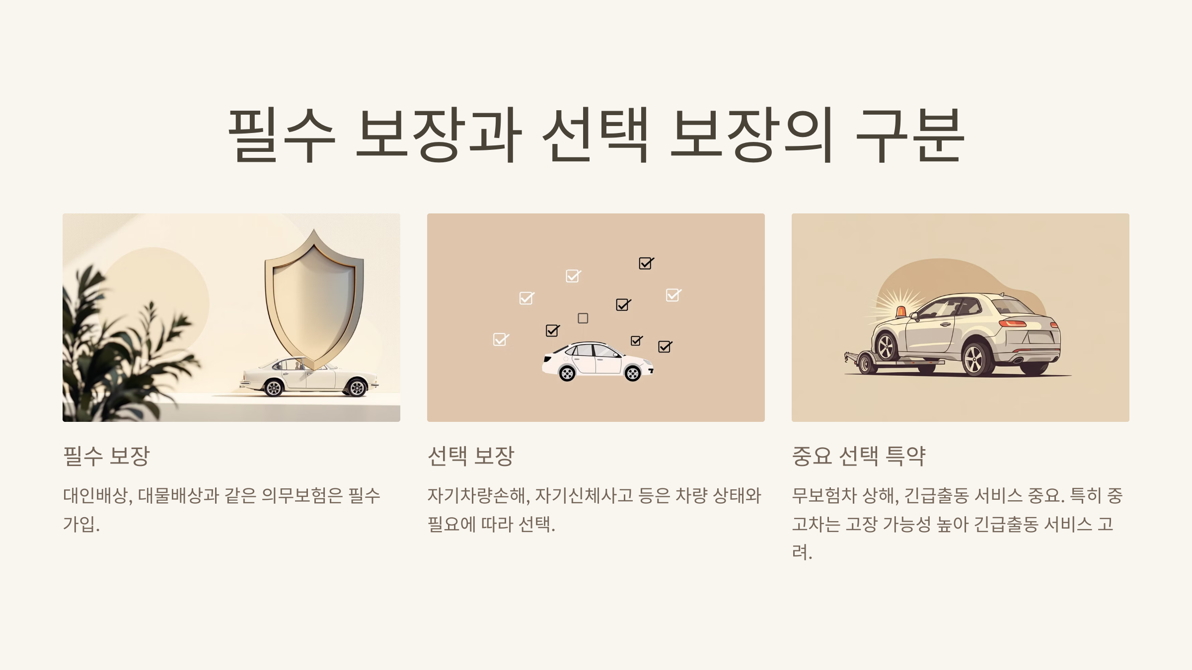 중고차 보험에서 가장 중요한 것은 필수 보장과 선택 보장을 명확히 구분하는 것입니다. 대인배상, 대물배상과 같은 의무보험은 반드시 가입해야 하며, 자기차량손해나 자기신체사고 등은 차량 상태와 운전자의 필요에 따라 선택할 수 있습니다. 특히 연식이 오래된 중고차의 경우, 자기차량손해 보험의 실효성을 잘 따져봐야 합니다. 보다 자세한 신차 보험과의 차이점은 중고차와 신차 보험료 책정 기준의 차이점에서 확인할 수 있습니다.