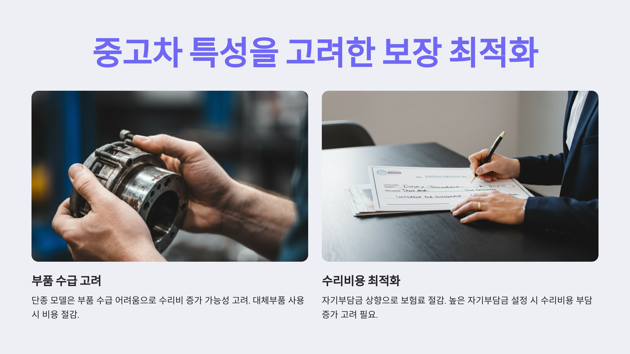 중고차는 부품 수급과 수리비용을 고려한 보장 설계가 필요합니다. 동일 차종이라도 연식에 따라 부품 공급망이 달라질 수 있으므로, 우선 해당 차종의 부품 수급 현황을 파악해야 합니다. 예를 들어, 단종된 모델의 경우 순정부품 사용 특약은 실효성이 떨어질 수 있으며, 대신 호환성 있는 대체부품 사용을 허용하면 보험료를 5~10% 절감할 수 있습니다.