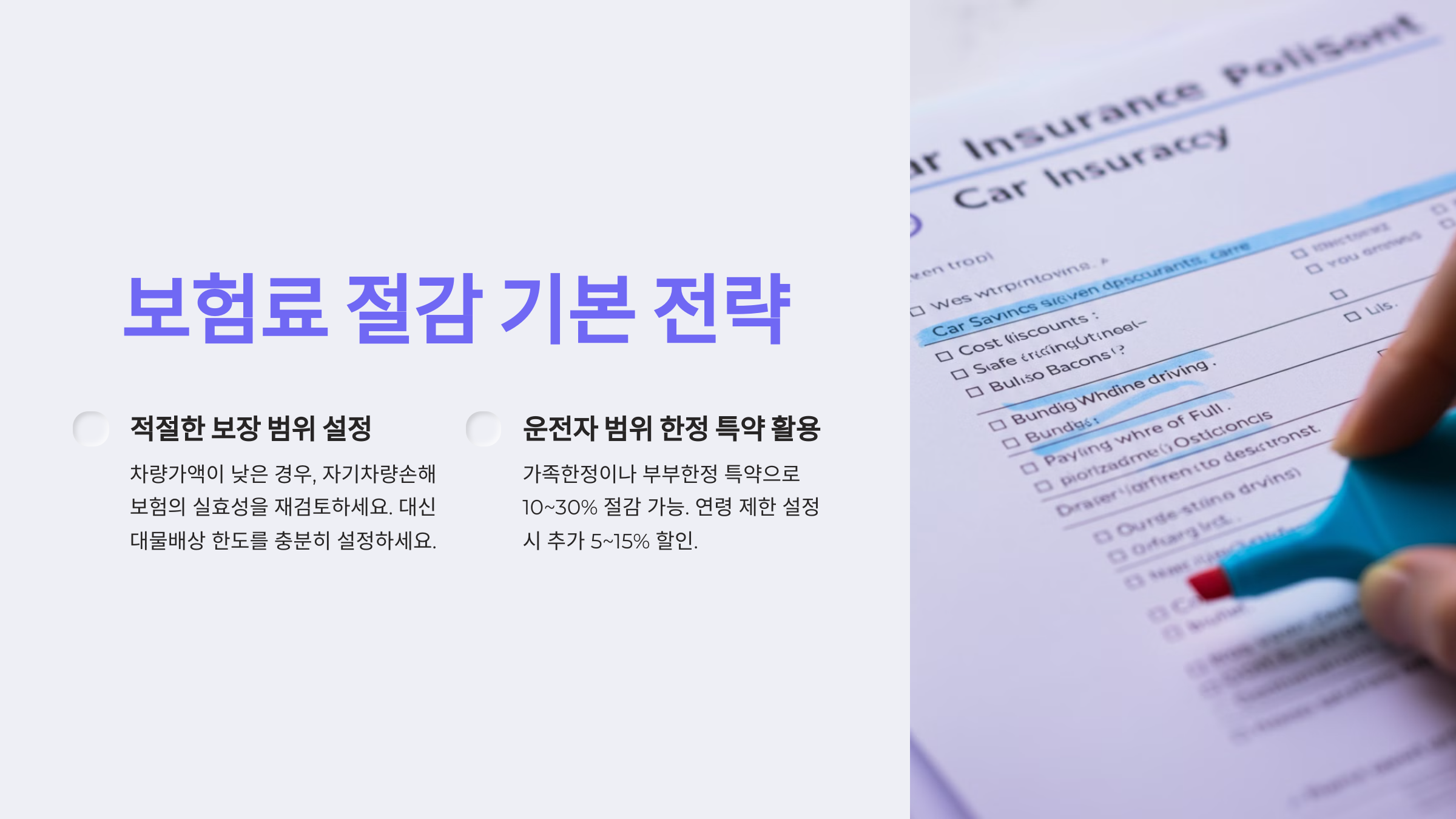 중고차 소유자들은 차량 유지비용을 줄이기 위해 보험료 절감에 특히 관심이 많습니다. 중고차 구매 시 적합한 보험 상품 선택법을 기본으로 하여, 중고차와 신차 보험료 책정 기준의 차이점을 이해하면서 실질적인 보험료 절감 방안을 알아보겠습니다.