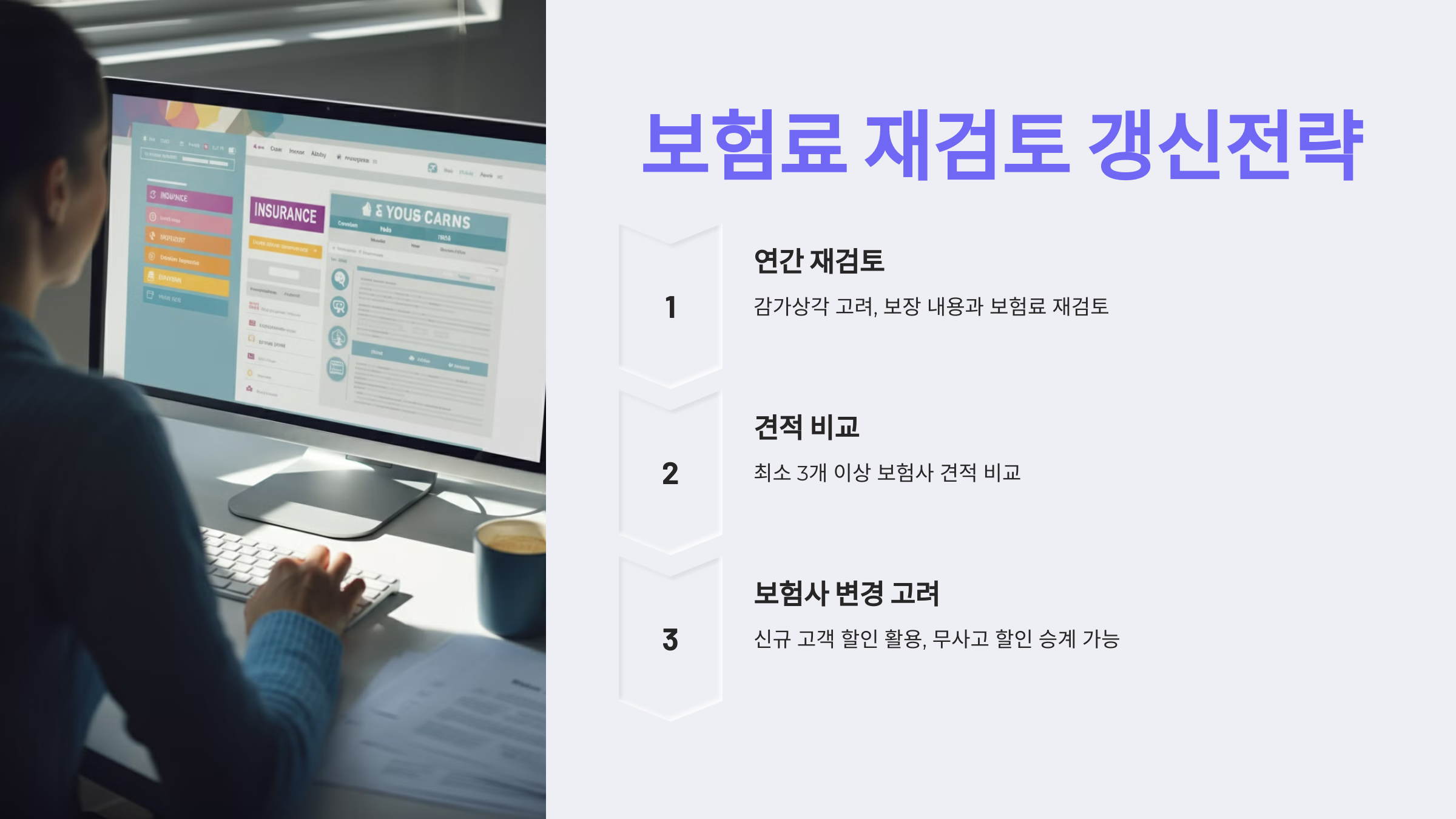 매년 보험 갱신 시기에는 반드시 보장 내용과 보험료를 재검토해야 합니다. 차량의 감가상각을 고려하여 자기차량손해 보험 가입 여부를 결정하고, 운전 패턴이나 차량 사용 목적의 변화에 따라 특약을 조정할 수 있습니다. 최소 3개 이상의 보험사 견적을 비교하는 것이 좋으며, 현재 가입된 보험사에 경쟁사 견적을 보여주며 협상하면 추가 할인을 받을 수 있는 경우도 있습니다.