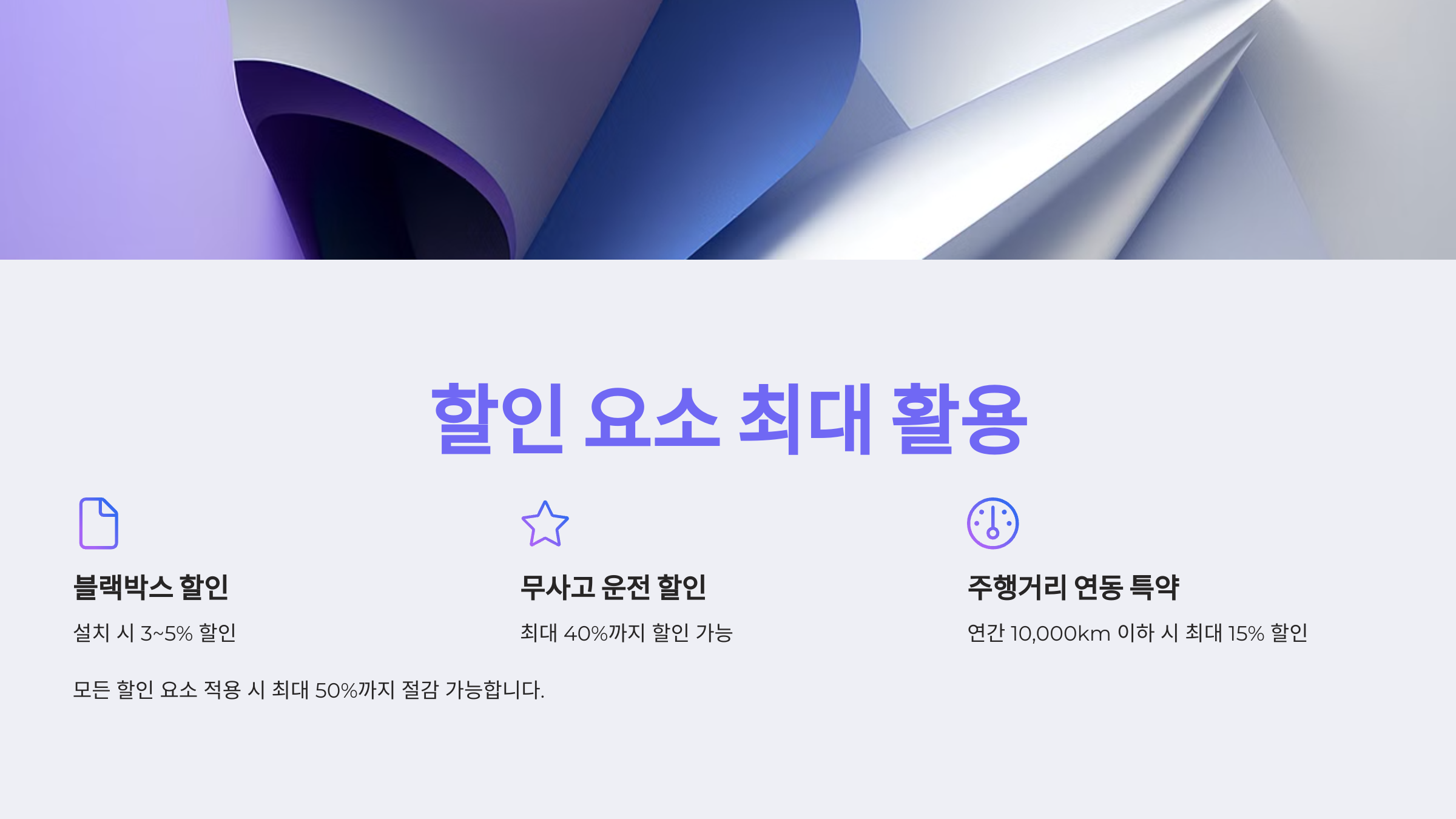 중고차도 다양한 할인 혜택을 받을 수 있습니다. 블랙박스 설치 시 3~5%, 무사고 운전 경력에 따라 최대 40%까지 할인이 가능합니다. 특히 주행거리 연동 특약을 활용하면 큰 폭의 할인을 받을 수 있는데, 연간 주행거리가 10,000km 이하일 경우 최대 15%까지 할인됩니다. 실제 사례를 보면, 모든 할인 요소를 적용했을 때 연간 보험료를 최대 50%까지 절감한 경우도 있습니다.
