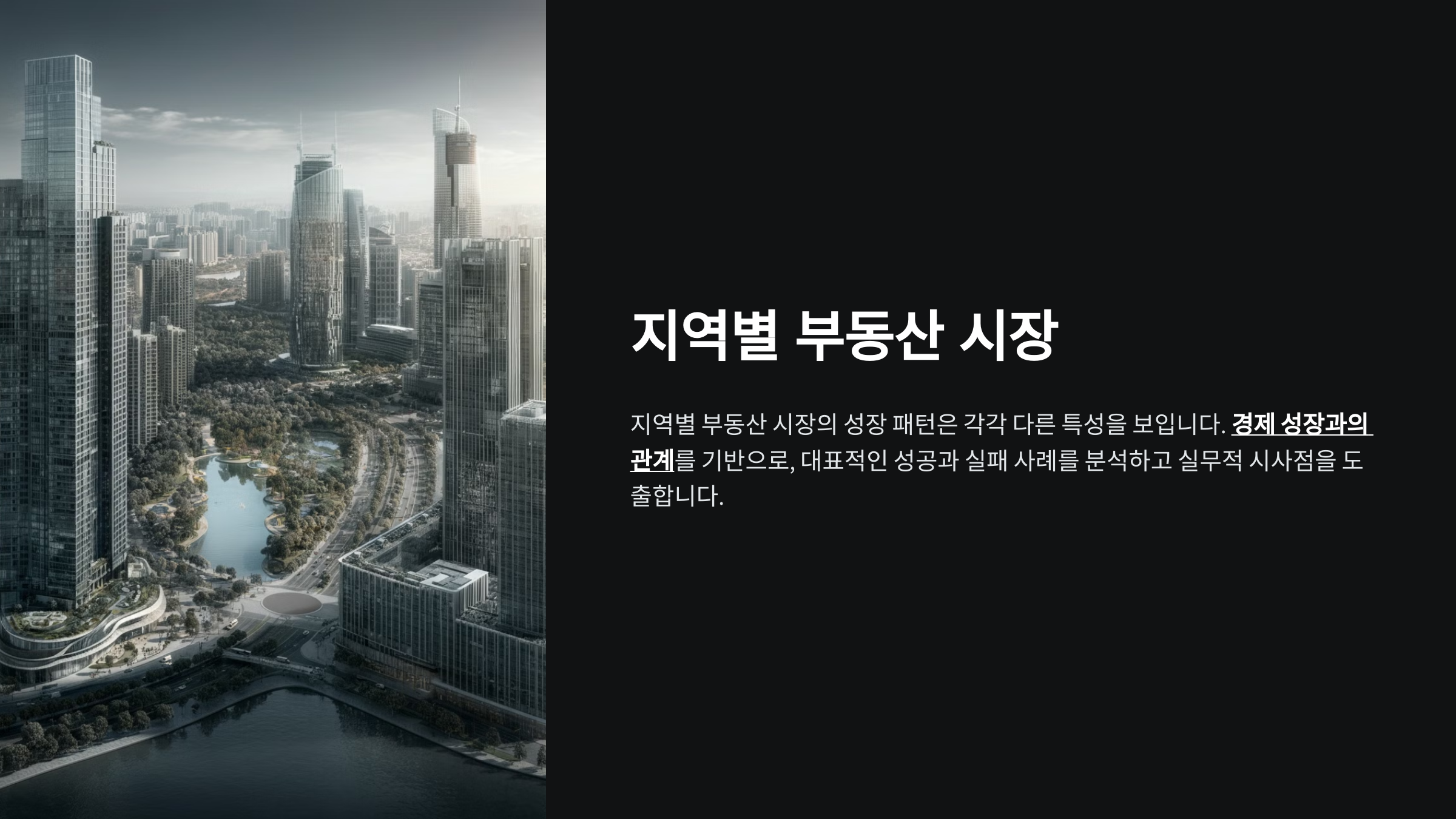 지역별 부동산 시장의 성장 패턴은 각각 다른 특성을 보입니다. 경제 성장과의 관계를 기반으로, 대표적인 성공과 실패 사례를 분석하고 실무적 시사점을 도출합니다.