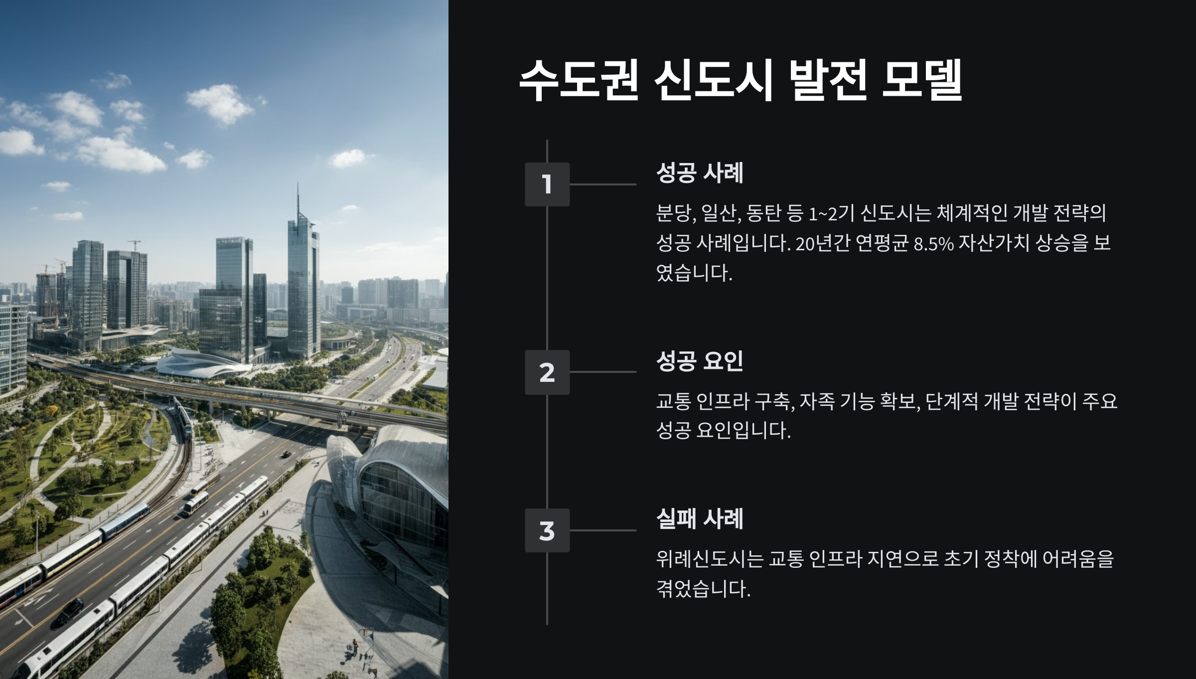 성공 요인은 교통 인프라 구축, 자족 기능 확보, 단계적 개발 전략입니다. 반면 위례신도시는 교통 인프라 지연으로 초기 정착에 어려움을 겪었습니다. 역사적 변화 과정에서 볼 수 있듯이, 인프라의 적시 공급이 핵심입니다.