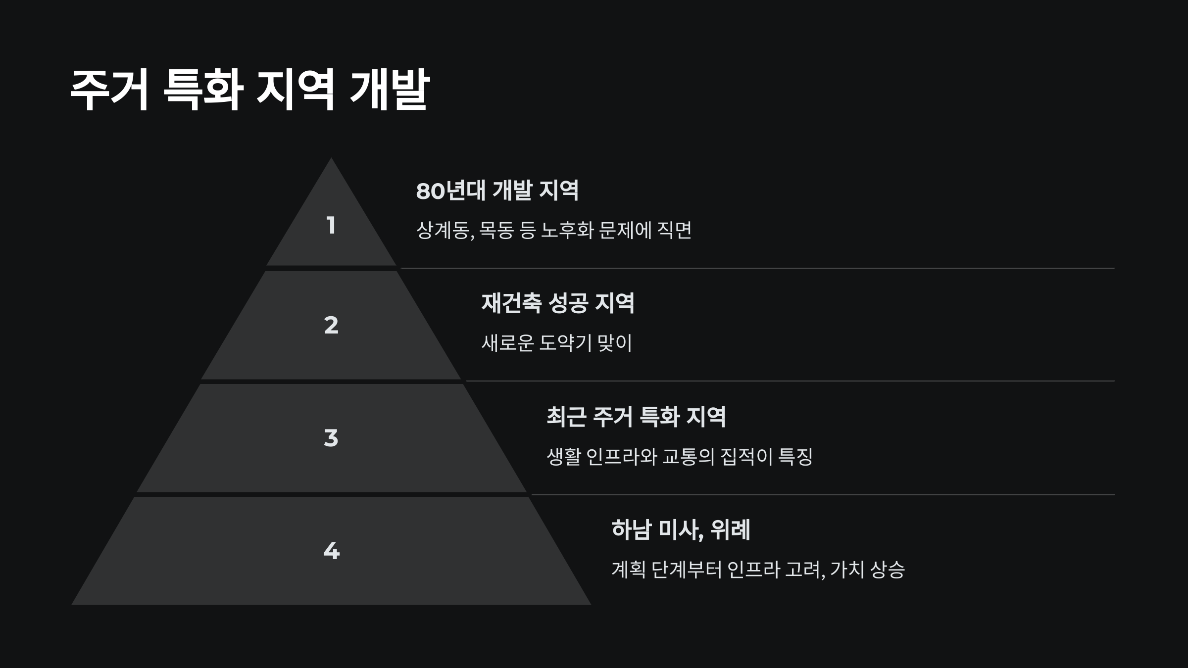 상계동, 목동 등 80년대 개발된 주거 특화 지역은 노후화 문제에 직면했습니다. 재건축을 성공적으로 진행한 지역은 새로운 도약기를 맞이했으나, 사업이 지연된 지역은 슬럼화 우려가 있습니다.