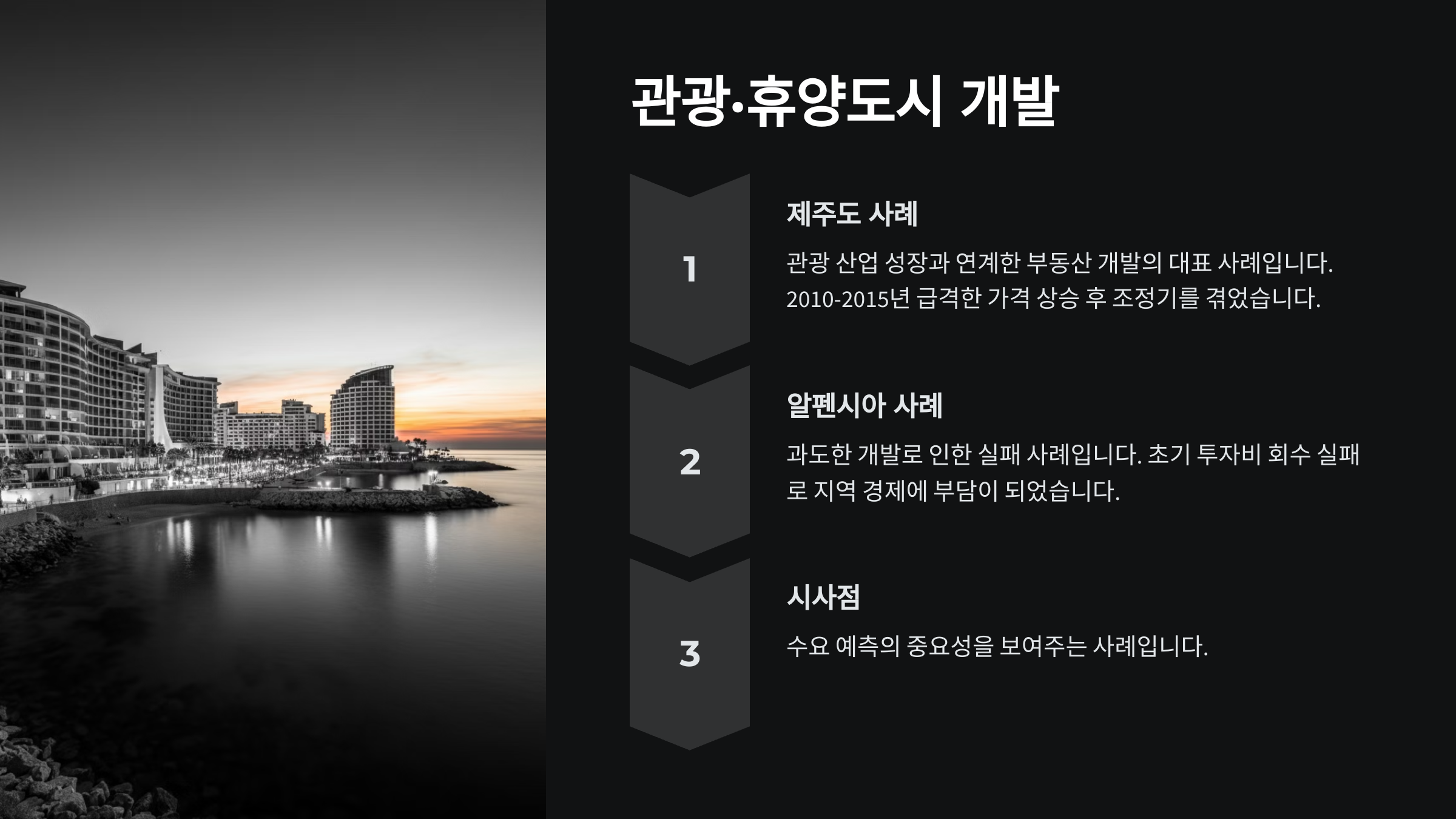 제주도는 관광 산업 성장과 연계한 부동산 개발의 대표 사례입니다. 2010-2015년 급격한 가격 상승 후 조정기를 겪었으나, 시장 트렌드에 맞춘 새로운 개발이 진행 중입니다.