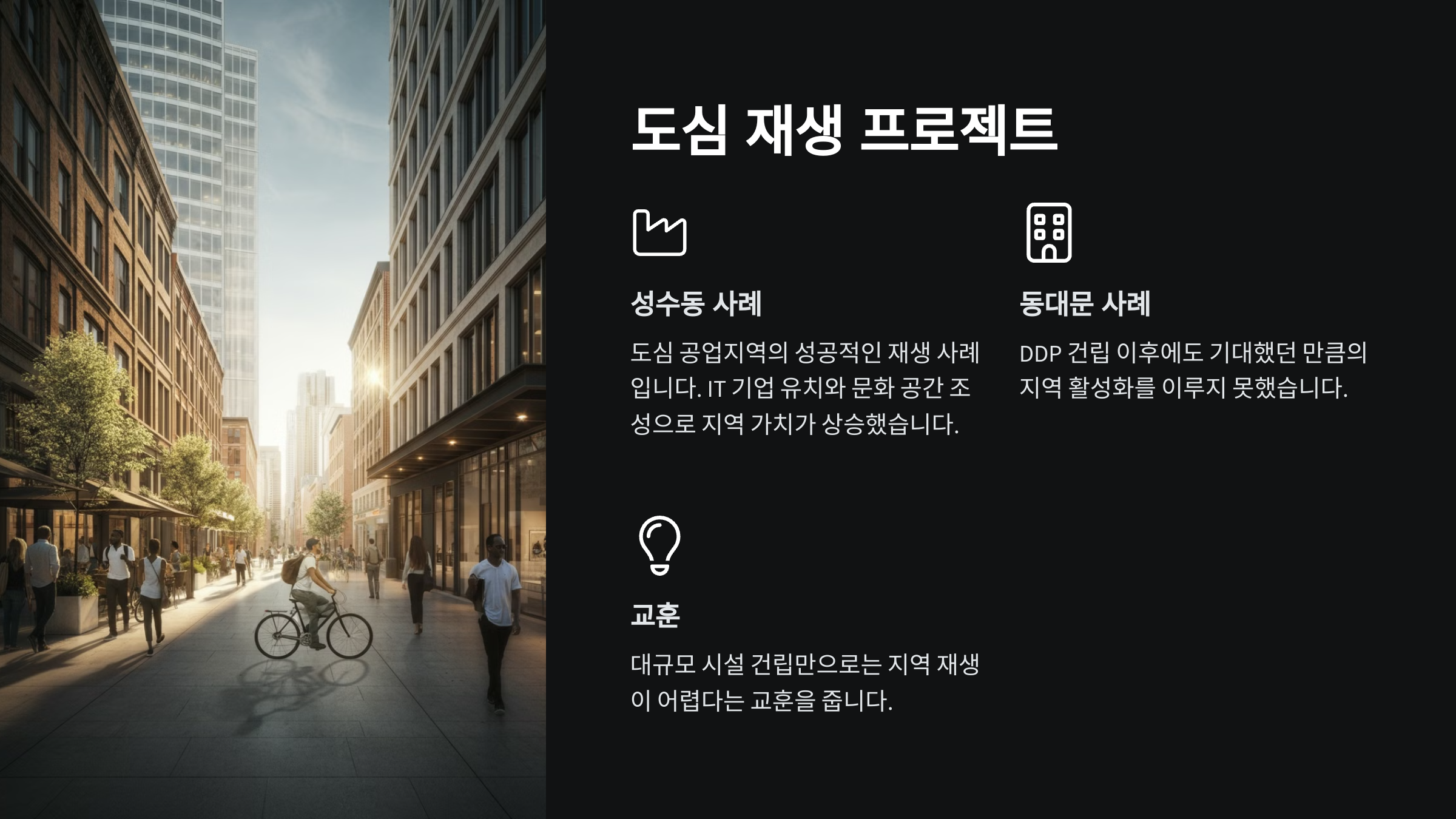 동대문 지역은 DDP 건립 이후에도 기대했던 만큼의 지역 활성화를 이루지 못했습니다. 대규모 시설 건립만으로는 지역 재생이 어렵다는 교훈을 줍니다.