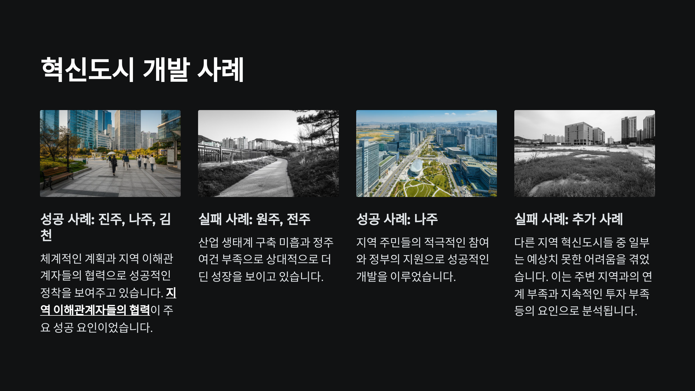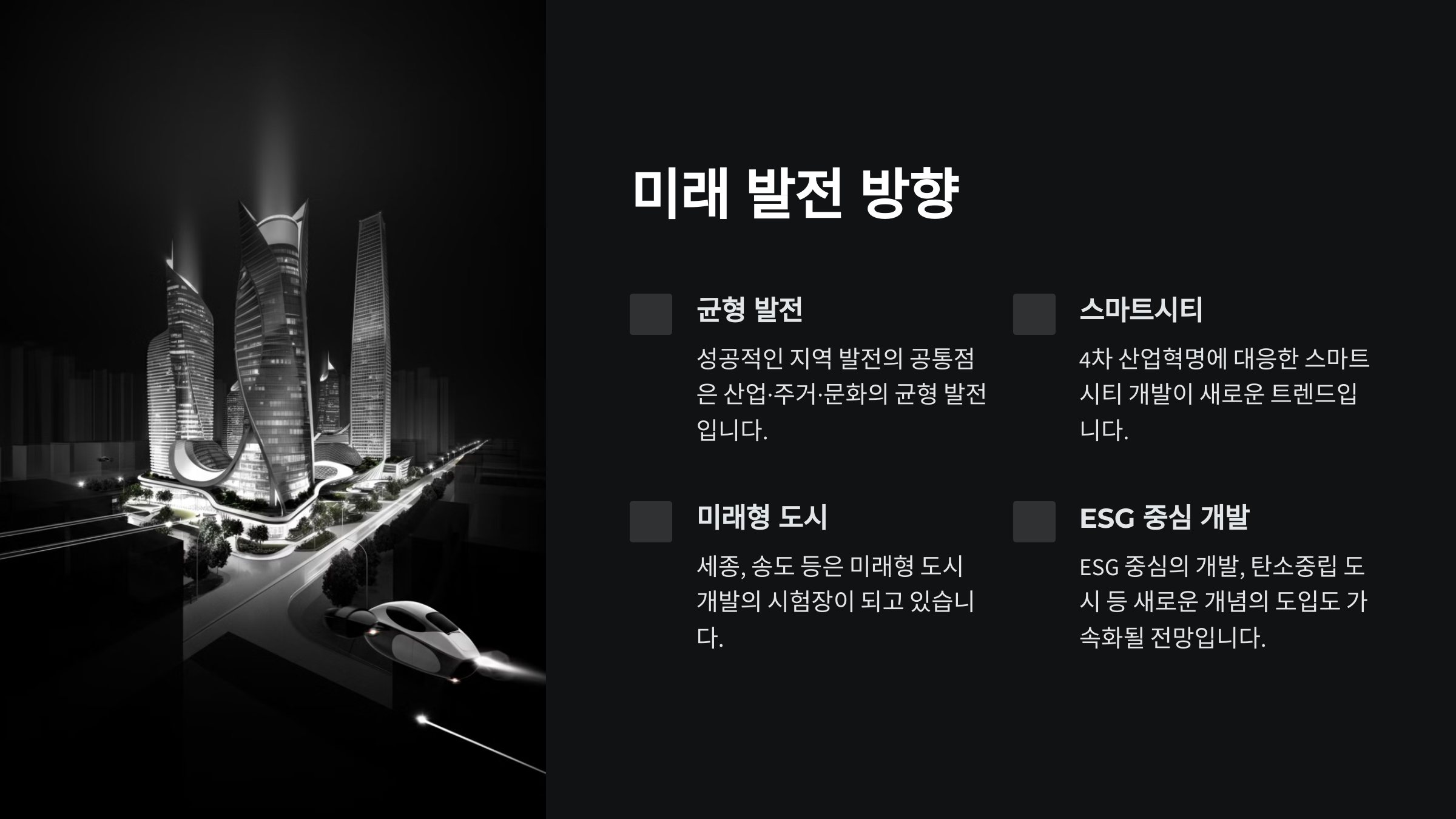 성공적인 지역 발전의 공통점은 산업·주거·문화의 균형 발전입니다. 단순한 베드타운이나 산업단지는 더 이상 경쟁력을 가질 수 없습니다. 4차 산업혁명에 대응한 스마트시티 개발이 새로운 트렌드입니다.