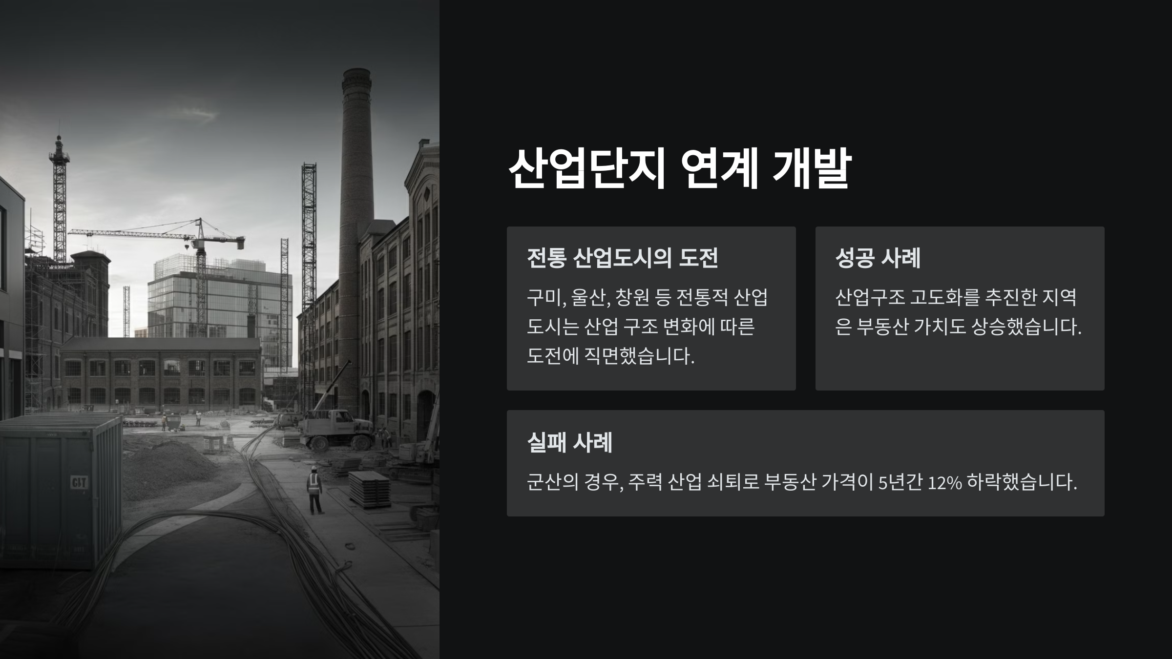 반면 산업 구조 전환에 실패한 지역은 부동산 시장도 침체되었습니다. 군산의 경우, 주력 산업 쇠퇴로 부동산 가격이 5년간 12% 하락했습니다. 산업단지 혁신과 도시 재생이 동시에 필요한 상황입니다.