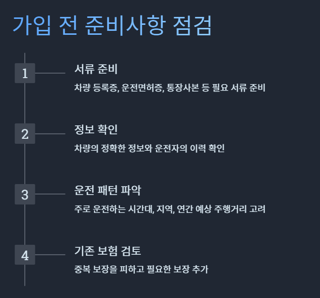 보험 가입 전에는 자신의 운전 패턴과 필요한 보장 범위를 명확히 파악해야 합니다. 주로 운전하는 시간대와 지역, 연간 예상 주행거리 등을 고려하여 적절한 보장을 선택할 수 있습니다. 차량의 시가와 수리 이력도 중요한 정보입니다. 기존에 가입한 다른 보험의 보장 내용을 확인하여 중복 보장을 피하고, 필요한 보장을 추가하는 것이 효율적입니다. 보험료 납입 방식과 할인 조건도 미리 검토하면 좋습니다.