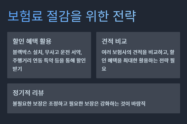 A: 블랙박스 설치, 무사고 운전 서약, 주행거리 연동 특약 등을 통해 할인받을 수 있습니다. 또한 여러 보험사의 견적을 비교하고, 자동차 보험 가입 시 제공되는 각종 할인 혜택을 최대한 활용하는 것이 좋습니다.