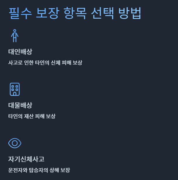 초보 운전자를 위한 자동차 보험 필수 보장 항목에는 대인배상, 대물배상, 자기신체사고가 포함됩니다. 대인배상은 사고로 인한 타인의 신체 피해를, 대물배상은 타인의 재산 피해를 보상합니다. 자기신체사고는 운전자와 탑승자의 상해를 보장하는 중요한 항목입니다. 이러한 기본 보장은 운전 초기에 발생할 수 있는 다양한 위험을 커버합니다.