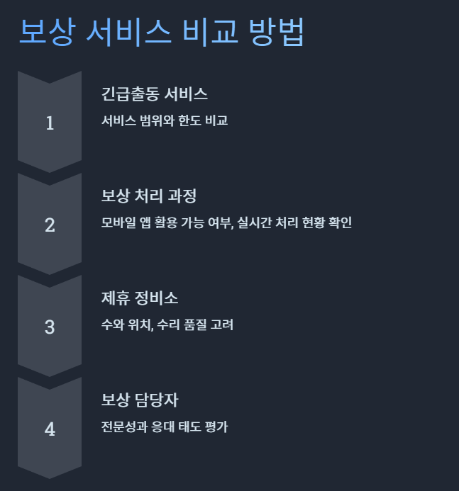 각 보험사의 보상 서비스는 세부적인 차이가 있으므로 꼼꼼한 비교가 필요합니다. 자동차 보험 보상 서비스의 핵심은 사고 발생 시 신속하고 정확한 처리입니다. 보험사별로 제공하는 긴급출동 서비스의 범위와 한도를 비교해야 합니다. 일부 보험사는 차량 견인, 배터리 방전, 타이어 교체 등 다양한 긴급 상황에 대한 무상 서비스를 제공합니다. 이러한 부가 서비스의 질이 전체적인 고객 만족도에 큰 영향을 미칩니다.