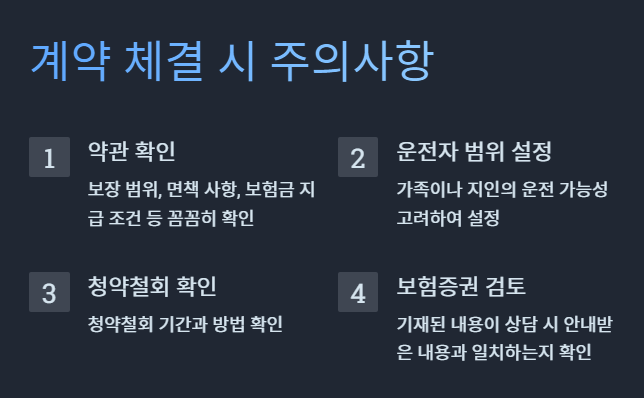 자동차 보험 계약 체결 시에는 약관의 세부 내용을 반드시 확인해야 합니다. 특히 보장 범위와 면책 사항, 보험금 지급 조건 등을 꼼꼼히 살펴보아야 합니다. 계약 전 알릴 의무 사항을 정확하게 고지하지 않으면 추후 보험금 지급에 문제가 발생할 수 있습니다. 보험 기간과 갱신 조건, 보험료 납입 방법 등 계약의 기본 사항도 명확히 이해해야 합니다. 특약의 세부 보장 내용과 한도도 확인이 필요합니다.