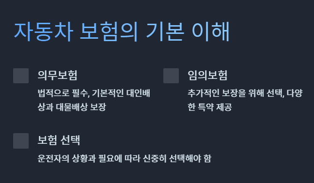 자동차 보험은 크게 의무보험과 임의보험으로 구분됩니다. 모든 차량 소유자는 법적으로 의무보험 가입이 필수이며, 이는 기본적인 대인배상과 대물배상을 보장합니다. 의무보험만으로는 실제 사고 발생 시 충분한 보상을 받기 어려운 경우가 많습니다. 따라서 대부분의 운전자들은 추가적인 보장을 위해 임의보험에 가입합니다.