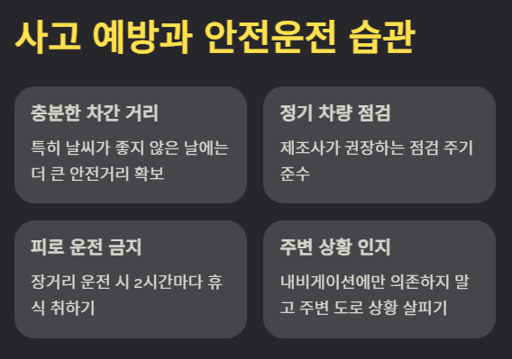 초보 운전자는 복잡한 도로나 악천후 시에는 가급적 운전을 피하는 것이 좋습니다. 불가피한 경우라면 더욱 신중한 운전이 필요합니다. 내비게이션에만 의존하지 말고 주변 도로 상황을 충분히 살피는 습관을 들여야 합니다. 피로 운전은 절대 금물이며, 장거리 운전 시에는 2시간마다 휴식을 취하는 것이 안전합니다. 이러한 안전운전 습관은 사고 예방뿐만 아니라 보험료 할인에도 도움이 됩니다.