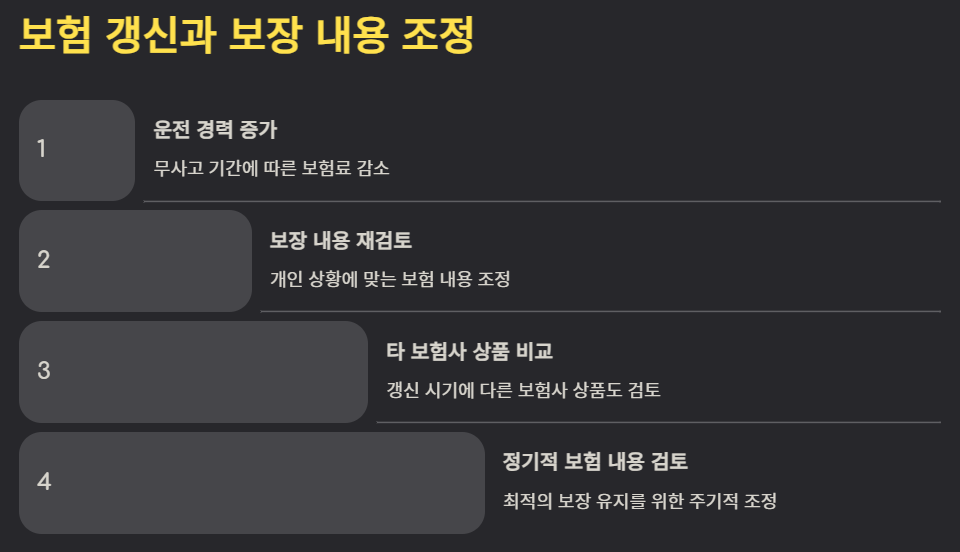 초보 운전자는 운전 경력이 쌓이면서 보험료와 보장 내용을 조정할 필요가 있습니다. 일반적으로 무사고 운전 기간이 늘어날수록 보험료는 감소하지만, 보장 내용은 개인의 상황에 맞게 재검토해야 합니다. 특히 차량 가액의 감소에 따라 자기차량손해보험의 가입 금액을 조정하거나, 운전 숙련도 향상에 따라 자기부담금을 조정할 수 있습니다. 보험 갱신 시기가 되면 다른 보험사의 상품도 비교해보는 것이 좋습니다.