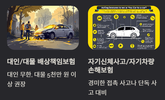 A: 초보 운전자는 기본적인 대인/대물 배상책임보험 외에도 자기차량손해보험, 자기신체사고보험에 반드시 가입하는 것이 좋습니다. 특히 대인배상은 무한으로, 대물배상은 최소 5천만 원 이상으로 설정하는 것을 추천합니다.