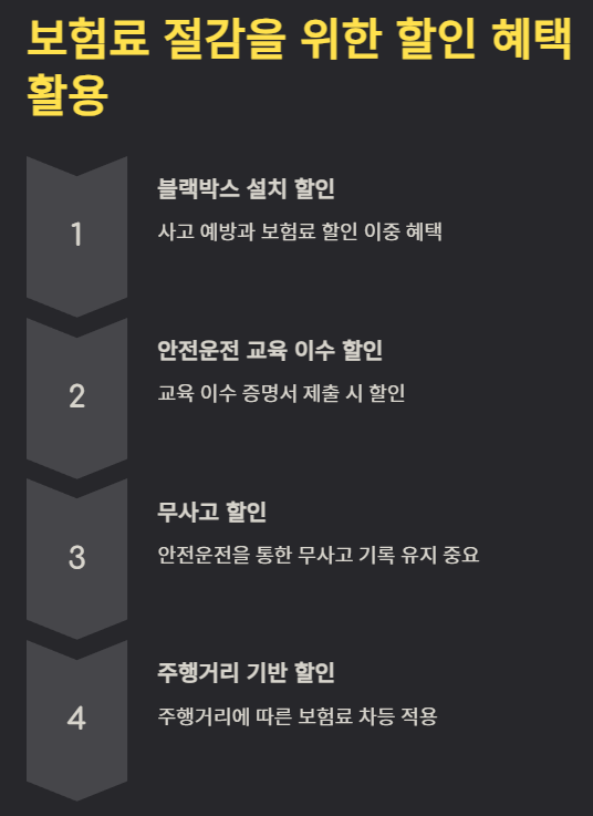 보험료 부담을 줄이기 위해서는 다양한 할인 제도를 적극 활용해야 합니다. 초보 운전자도 이용할 수 있는 할인 혜택으로는 블랙박스 설치 할인, 안전운전 교육 이수 할인, 무사고 할인 등이 있습니다. 특히 블랙박스 설치는 사고 예방과 보험료 할인이라는 이중 혜택을 제공하므로 적극 추천됩니다. 일부 보험사에서는 차량 안전장치 장착 시 추가 할인을 제공하므로 차량 구매 시 이를 고려하는 것이 좋습니다.