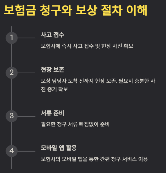 초보 운전자가 알아야 할 중요한 부분 중 하나는 보험금 청구와 보상 절차입니다. 사고 발생 시 가장 먼저 해야 할 일은 보험사에 사고 접수를 하고 현장 사진을 확보하는 것입니다. 경미한 사고라도 반드시 보험사에 통보하여 추후 발생할 수 있는 문제에 대비해야 합니다. 보험사의 보상 담당자가 현장에 도착하기 전까지는 가능한 현장을 보존하고, 부득이한 경우 충분한 사진 증거를 확보해야 합니다.